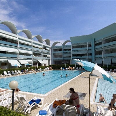 Rezidenční objekt apartmánů s bazény (villaggio), cca 1100 m od písčité pláže s pozvolným…
